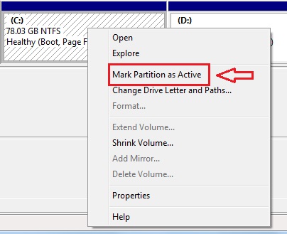 شما می توانید یک سی دی ویندوز درون دی وی دی درایوتان قرار دهید و از طریق دی وی دی درایو سیستم را بوت کنید و وارد محیط ویندوز شوید. سپس از طریق Disk Management و راست کلیک کردن روی درایو C و انتخاب گزینه Mark Partition as Active ، درایو C را به حالت Active دربیاورید. رویِ یک هارد حتما باید یک درایو (که اکثراً درایو ویندوز یعنی C) هست، به حالت فعال باشد تا سیستم بتواند درایو ویندوز را شناسایی کند. دی وی دی ویندوز را از دی وی دی درایو خارج کنید و سیستم را ریستارت کنید.