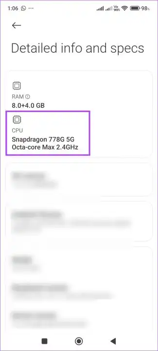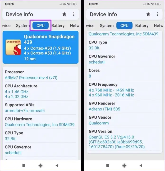 مرحله ۳: اکنون جزئیات پردازنده دستگاه نمایش داده میشود. در کنار سرعت پردازنده و اطلاعات مربوط به CPU، جزئیات مربوط به GPU نیز قابل مشاهده خواهد بود.