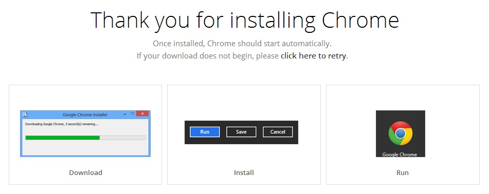 توجه داشته باشید، چنانچه نصب کننده گوگل کروم به صورت خودکار شروع به دانلود نکرد با کلیک بر روی عبارت Click here to retry ، دانلود بعد از چند ثانیه شروع خواهد شد.