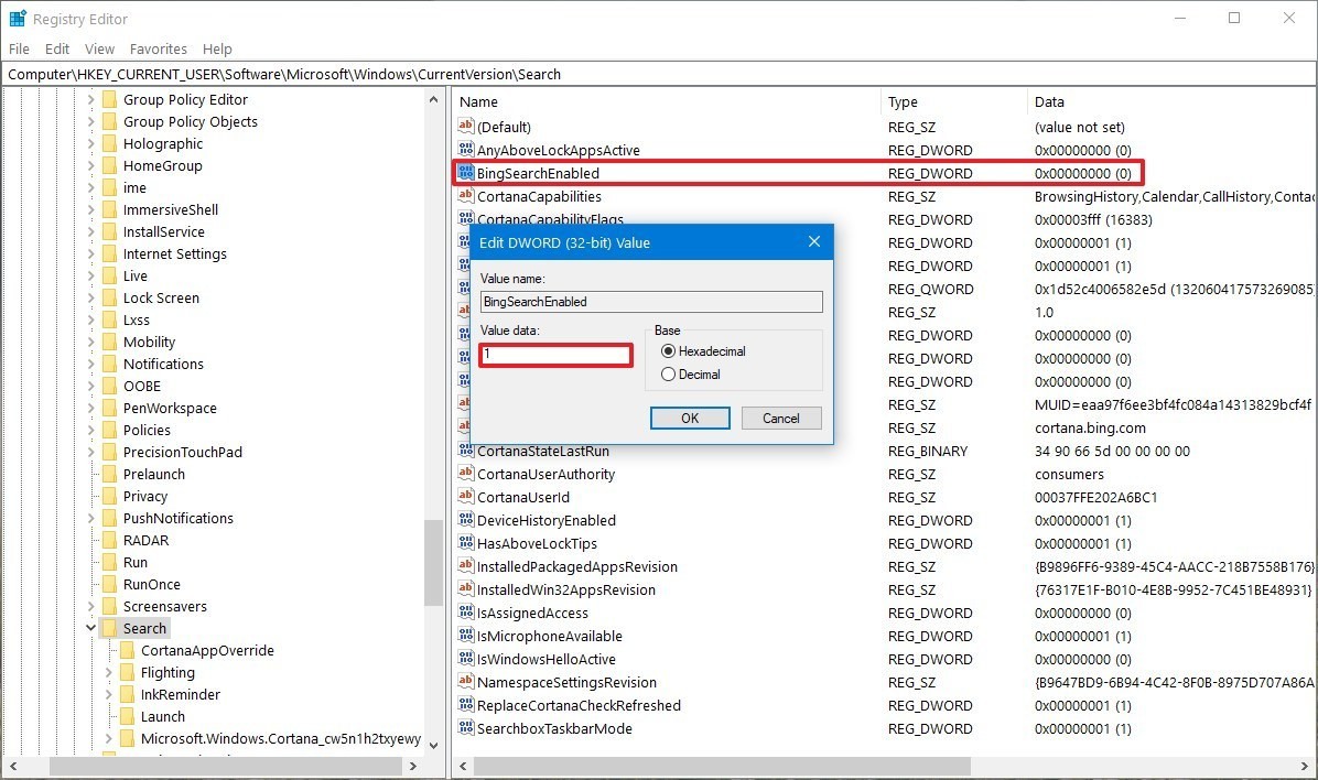 روی BingSearchEnabled DWORD دوبار کلیک کنید و مقدار را از 0 به 1 تنظیم کنید.